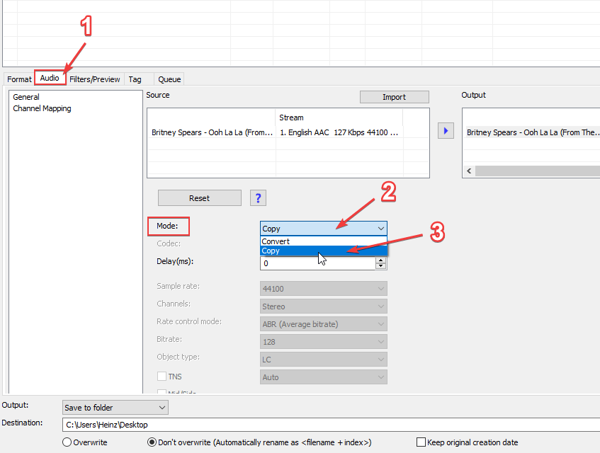 Then navigate to audio tab, and change mode from convert to copy to keep the codec intact