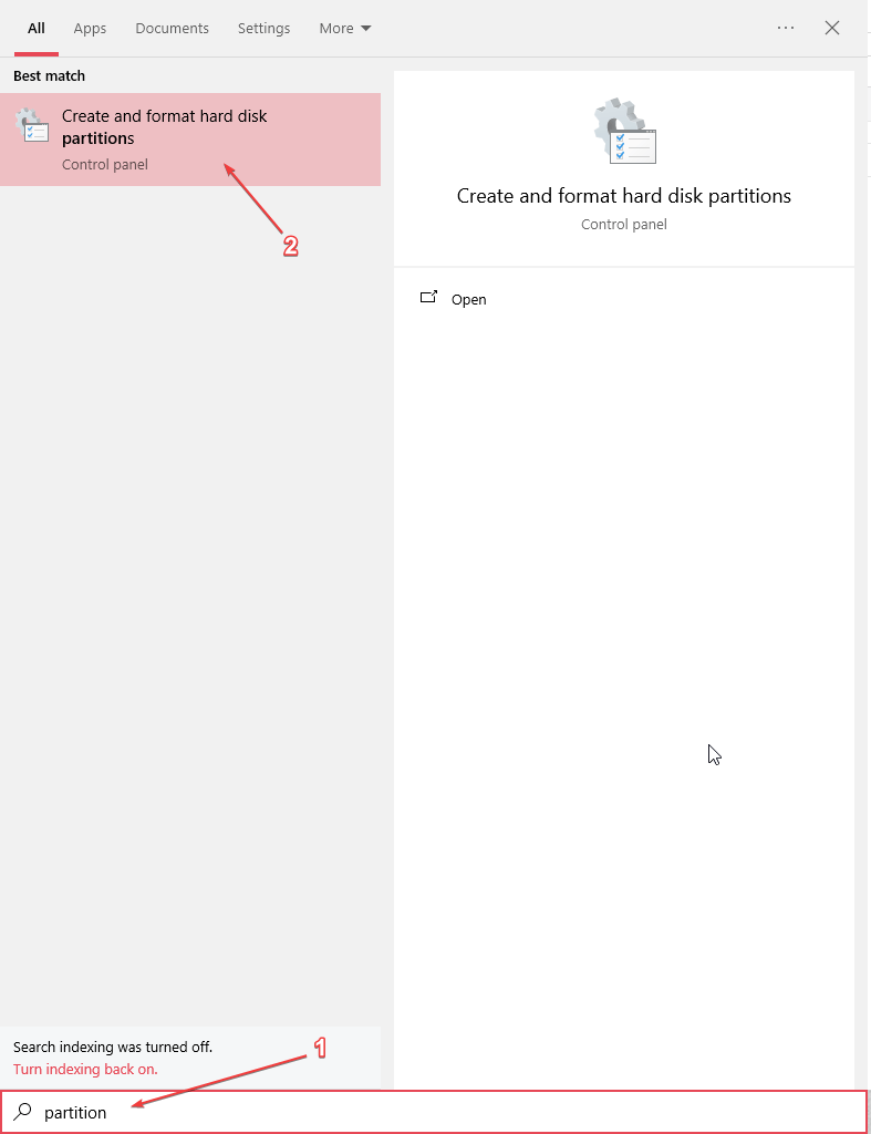 To check which partition style your disk is using open disk management by searching for partition then clicking on create and format hard disk partitions