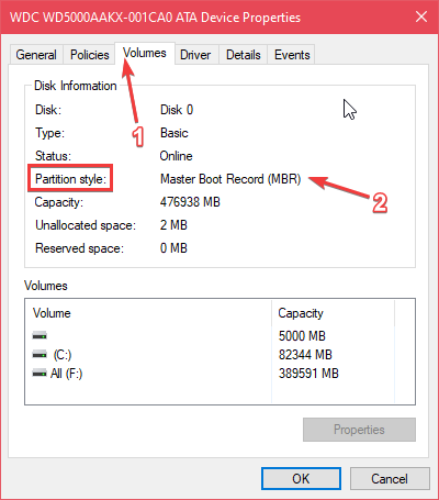 Then click on the “Volumes” tab, and check “Partition style”ย you’ll see either “Master Boot Record (MBR)” or “GUID Partition Table (GPT)