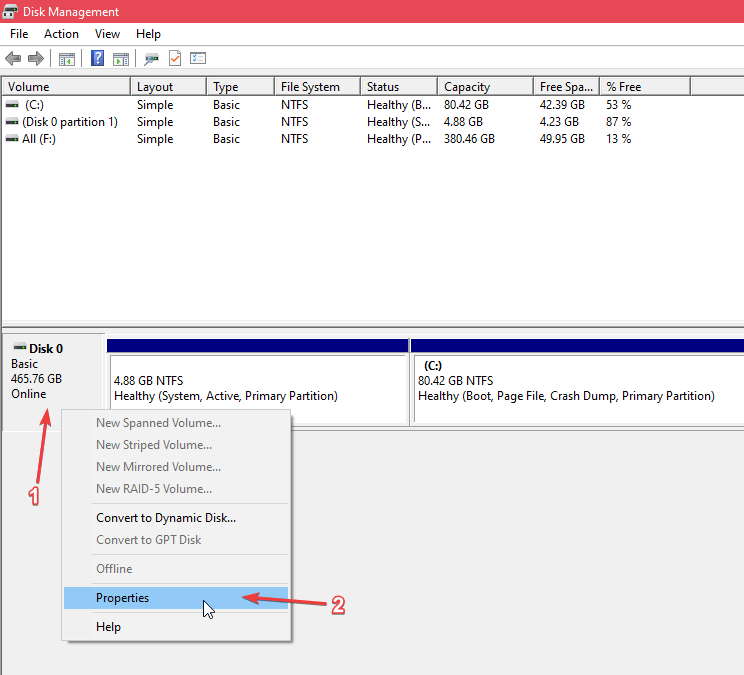 Locate the disk you want to check in the Disk Management window. (usually disk 0) Right-click it and select “Properties”